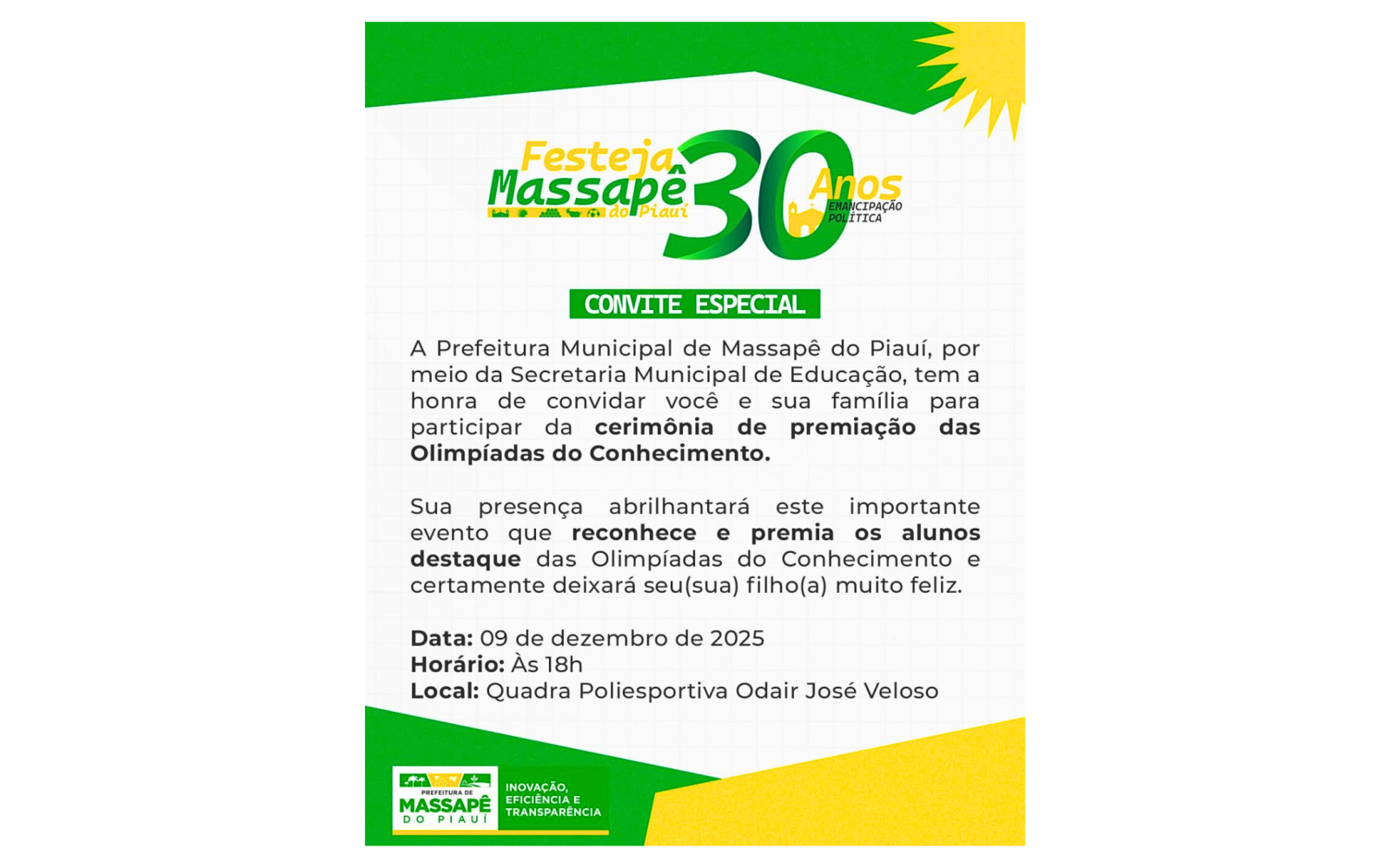 Na terça-feira, dia 9 de dezembro, Massapê do Piauí vivenciará um momento de grande significado para sua comunidade escolar: a cerimônia de premiação das Olimpíadas do Conhecimento, um evento dedicado ao reconhecimento do esforço, da dedicação e do talento dos estudantes da rede municipal de ensino.