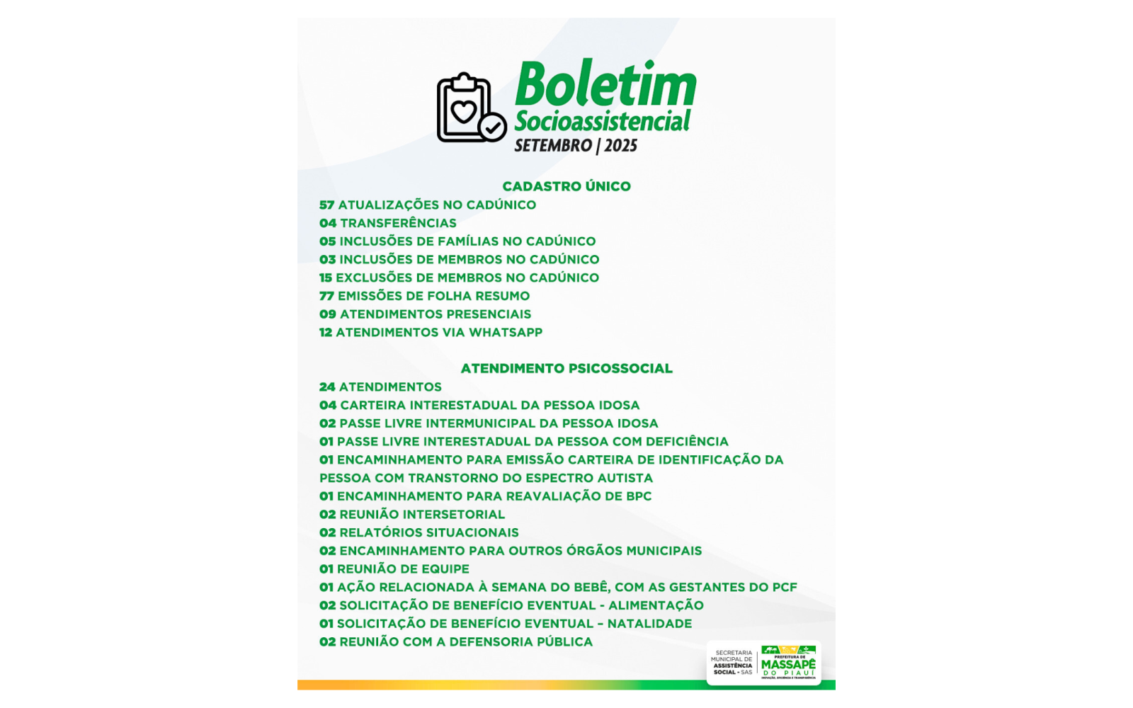 A Prefeitura de Massapê do Piauí, por meio da Secretaria Municipal de Assistência Social, divulgou o Boletim Socioassistencial referente ao mês de setembro de 2025. O documento apresenta as principais atividades realizadas no Cadastro Único e no setor de Atendimento Psicossocial, evidenciando o acompanhamento e o apoio oferecidos às famílias em situação de vulnerabilidade social no município.