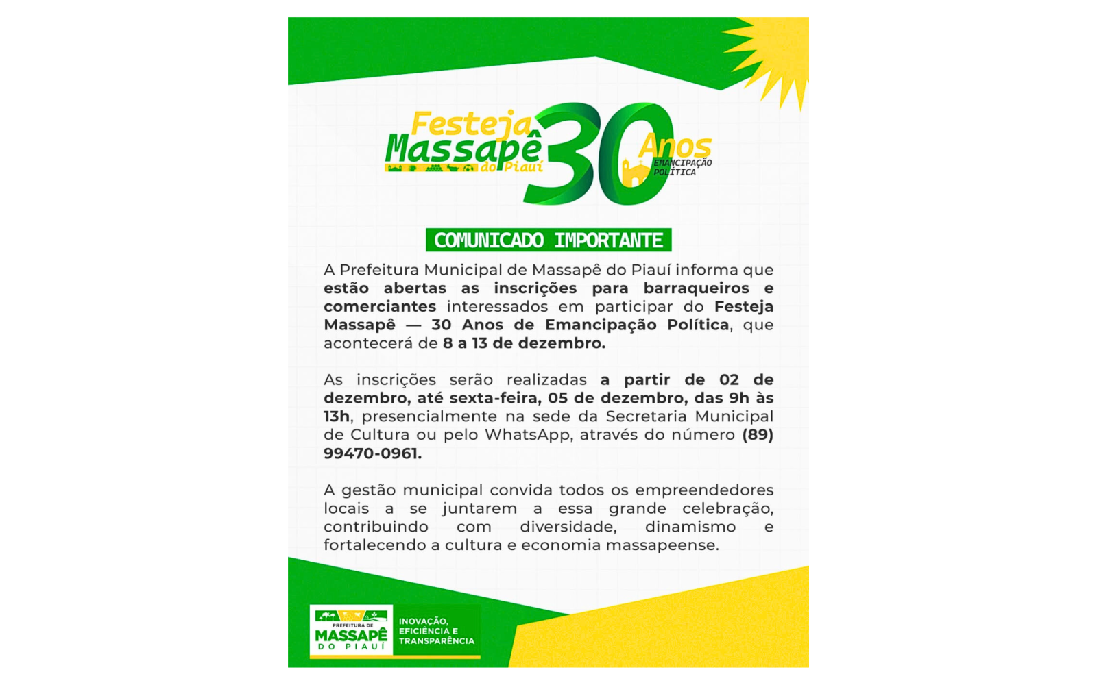 A Prefeitura de Massapê do Piauí reforça o convite a todos os empreendedores do município para que participem deste momento histórico, integrando-se às comemorações dos 30 anos de emancipação política e contribuindo para a construção de um evento marcante para toda a comunidade.