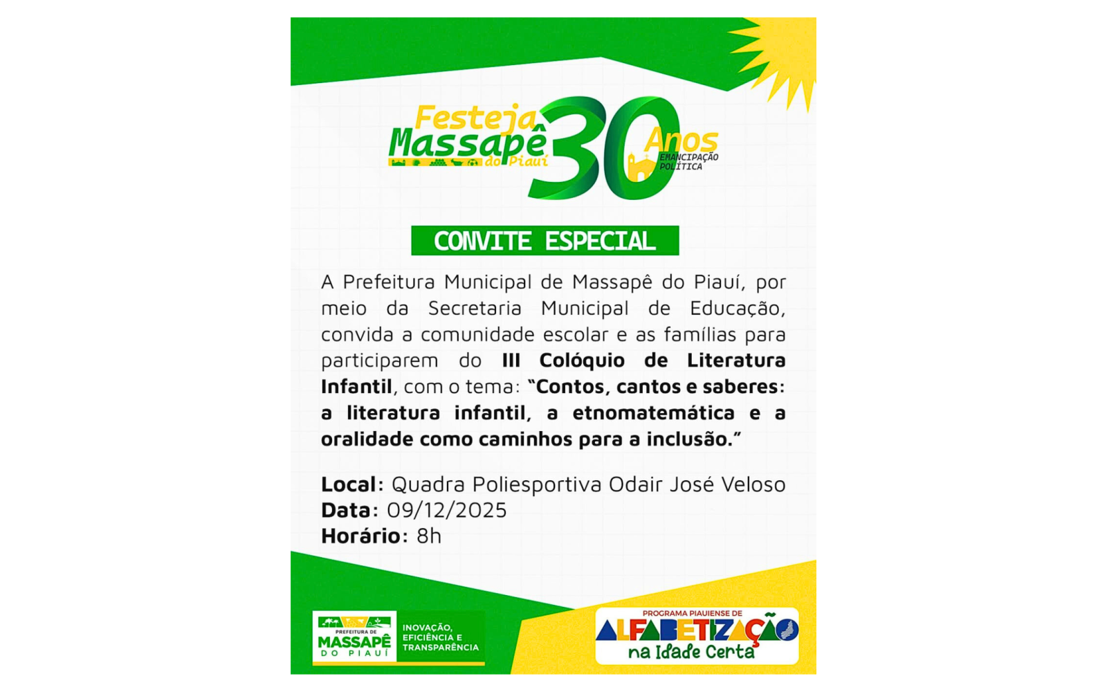 A Prefeitura Municipal de Massapê do Piauí, por meio da Secretaria Municipal de Educação, em conjunto com o Programa Piauiense de Alfabetização na Idade Certa (PPAIC), convida toda a população massapeense para participar do III Colóquio de Literatura Infantil, um evento que valoriza o conhecimento, incentiva a leitura e promove práticas educativas inclusivas.