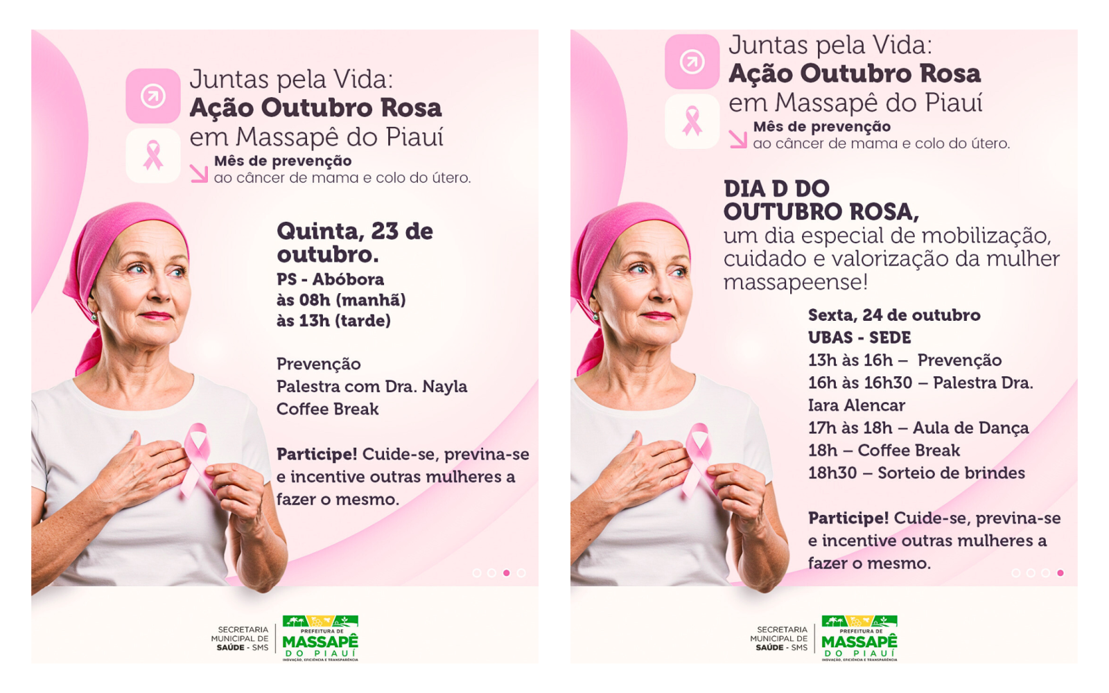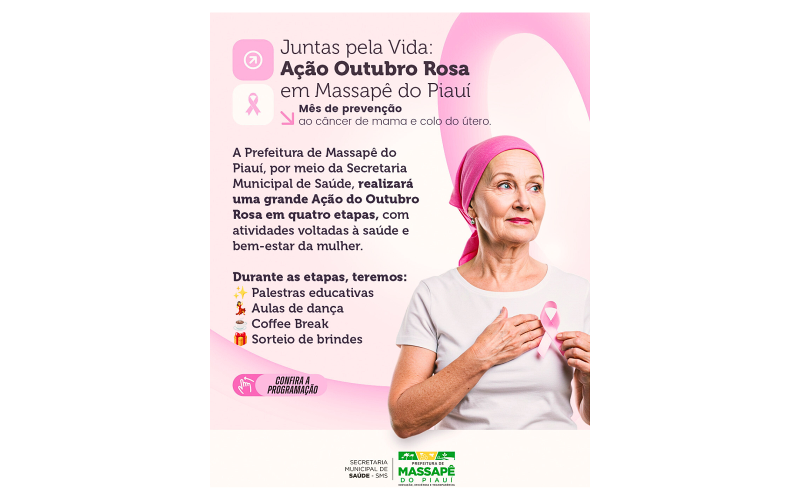 A Prefeitura de Massapê do Piauí, por meio da Secretaria Municipal de Saúde, realizará neste mês de outubro uma ampla programação da Ação Outubro Rosa – Juntas pela Vida, voltada à prevenção do câncer de mama e do colo do útero.