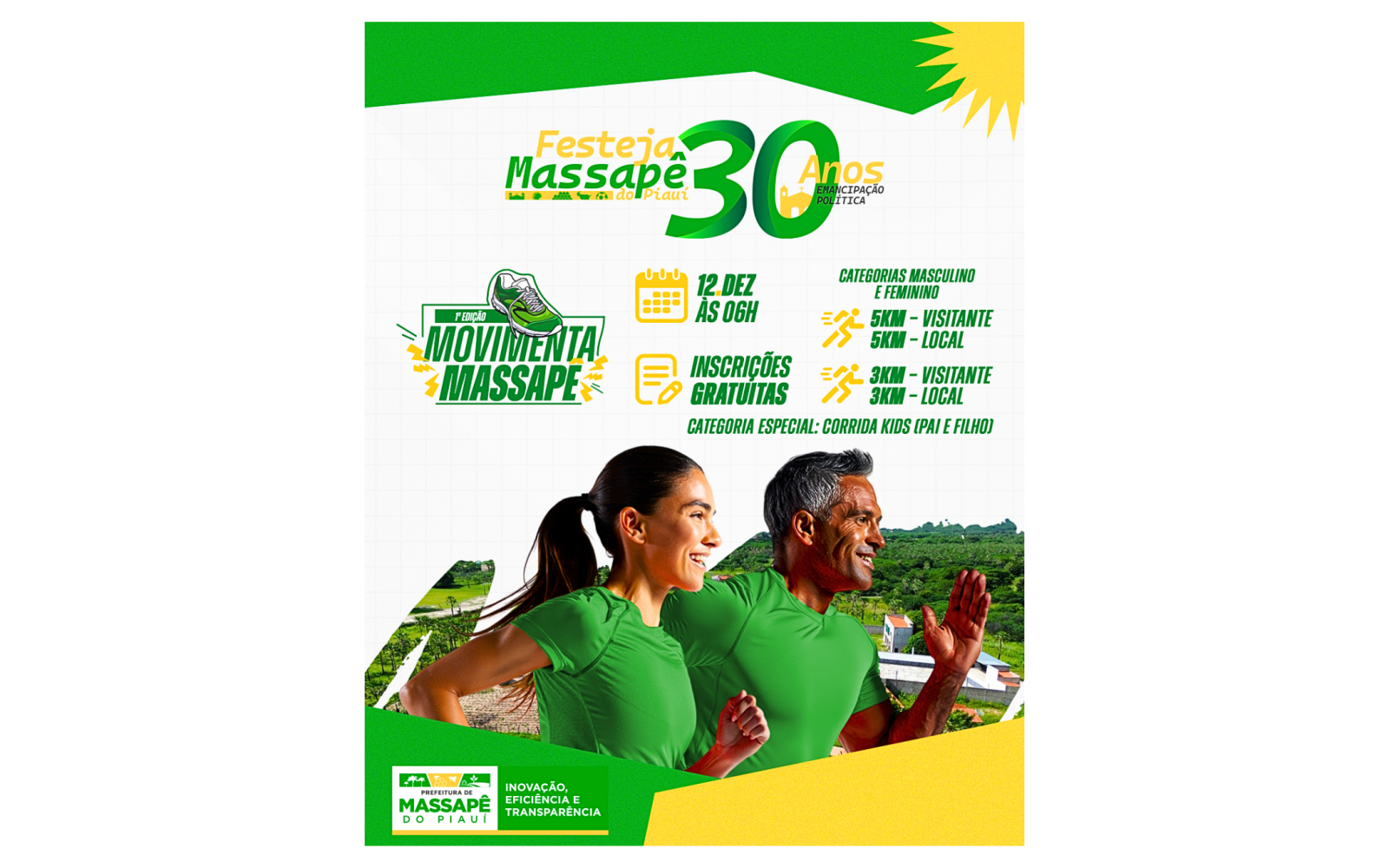 A Prefeitura de Massapê do Piauí realizará, no dia 12 de dezembro, às 6h, a 1ª edição do Movimenta Massapê, iniciativa esportiva que compõe o calendário comemorativo dos 30 anos de emancipação política do município. A ação foi planejada para incentivar a prática regular de atividades físicas, promover cuidados com a saúde e ampliar a participação da comunidade nas atividades alusivas à data.