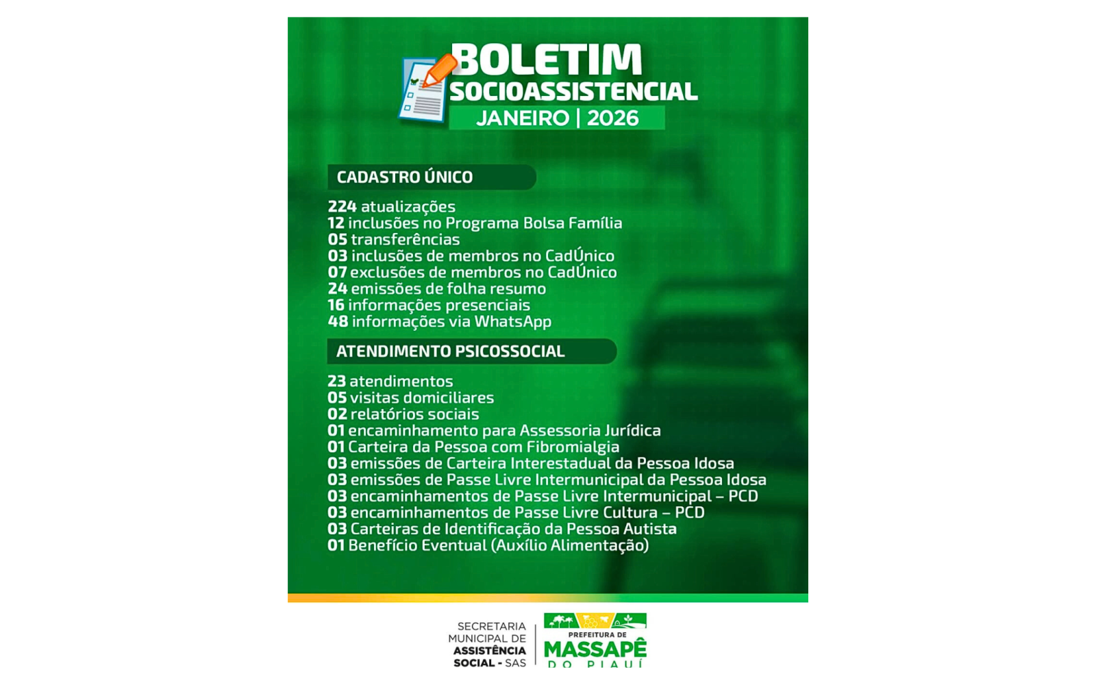 A Prefeitura de Massapê do Piauí, por meio da Secretaria Municipal de Assistência Social, Trabalho, Cidadania e Políticas Integradas, tornou público o Boletim Socioassistencial referente ao mês de janeiro de 2026. O documento reúne dados das ações desenvolvidas no Cadastro Único e no Atendimento Psicossocial, demonstrando o trabalho contínuo de acompanhamento e suporte às famílias em situação de vulnerabilidade no município.