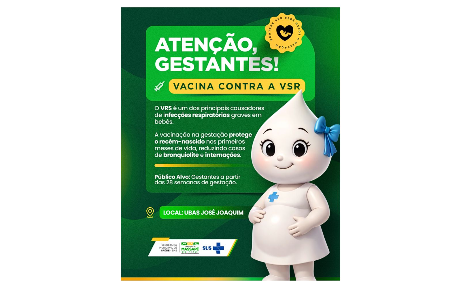 A Prefeitura de Massapê do Piauí, por meio da Secretaria Municipal de Saúde, está realizando a vacinação contra o Vírus Sincicial Respiratório (VSR) voltada para gestantes a partir das 28 semanas de gestação. A ação acontece na UBAS José Joaquim de Moraes e integra as estratégias de prevenção às doenças respiratórias no município.