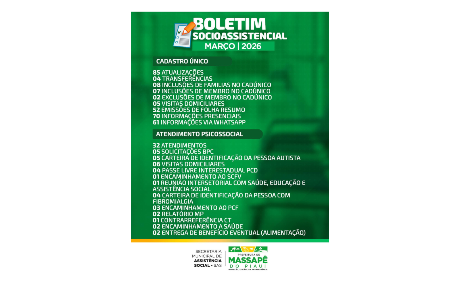 A Prefeitura de Massapê do Piauí, por meio da Secretaria Municipal de Assistência Social, Trabalho, Cidadania e Políticas Integradas, divulgou o Boletim da Vigilância Socioassistencial referente ao mês de março de 2026. O documento sistematiza as ações desenvolvidas nos serviços socioassistenciais do município, com destaque para o Cadastro Único e o Atendimento Psicossocial, evidenciando o acompanhamento contínuo das famílias em situação de vulnerabilidade social.