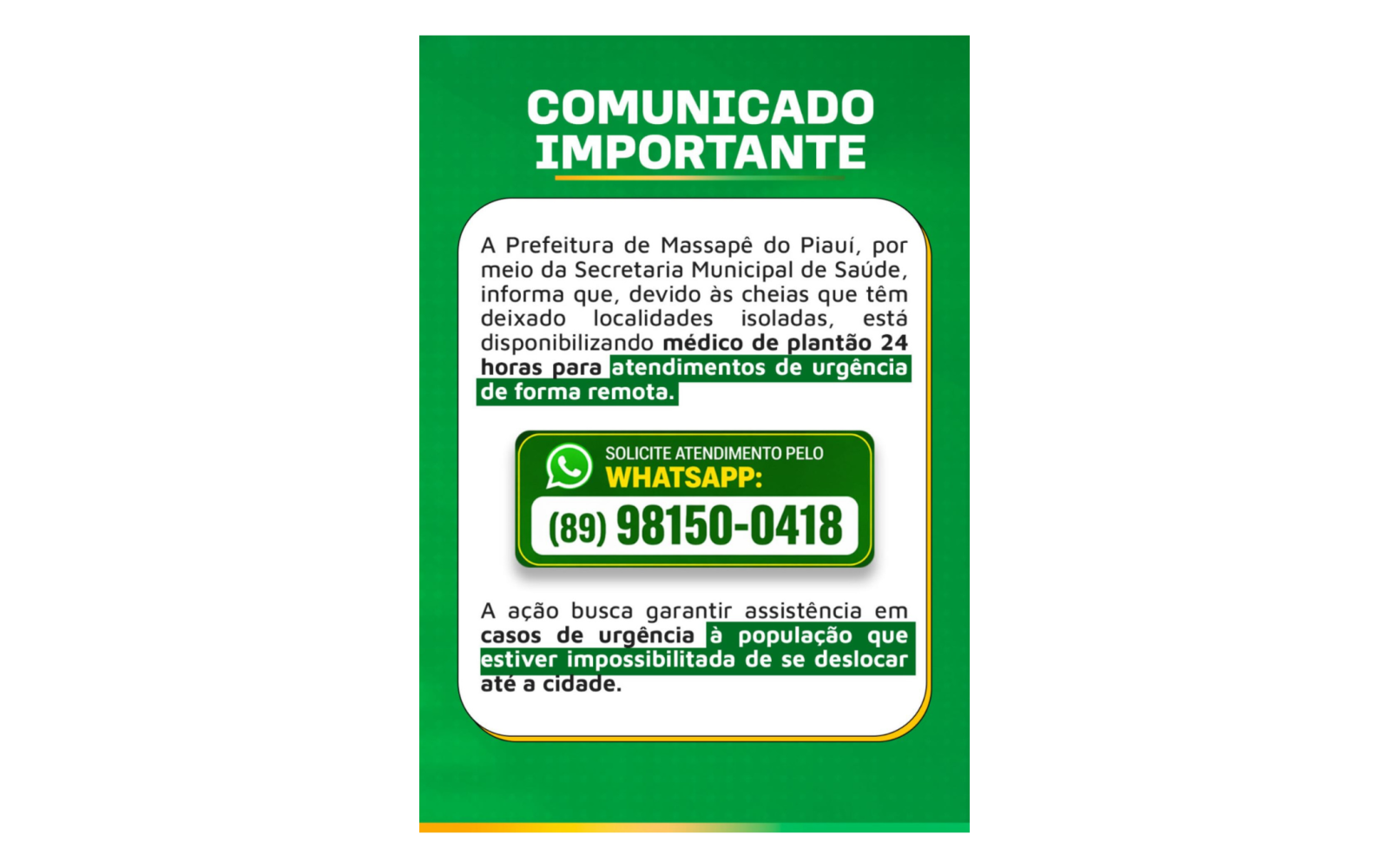 A Prefeitura de Massapê do Piauí, por meio da Secretaria Municipal de Saúde, informou a disponibilização de médico de plantão 24 horas para atendimentos de urgência, de forma remota, como medida emergencial diante das cheias dos rios que têm deixado localidades isoladas no município. A iniciativa busca assegurar o acesso aos serviços de saúde mesmo em situações em que o deslocamento até a sede da cidade esteja comprometido.