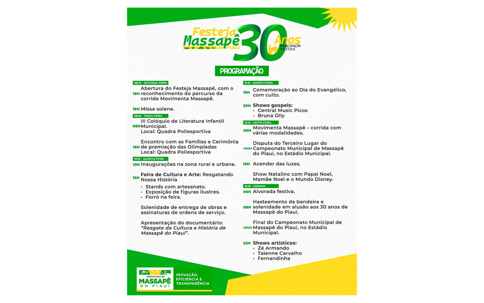 A Prefeitura de Massapê do Piauí divulgou a programação oficial em comemoração aos 30 anos de emancipação política do município. As atividades acontecerão entre os dias 8 e 13 de dezembro e incluirão ações culturais, esportivas, educativas e religiosas abertas à população.