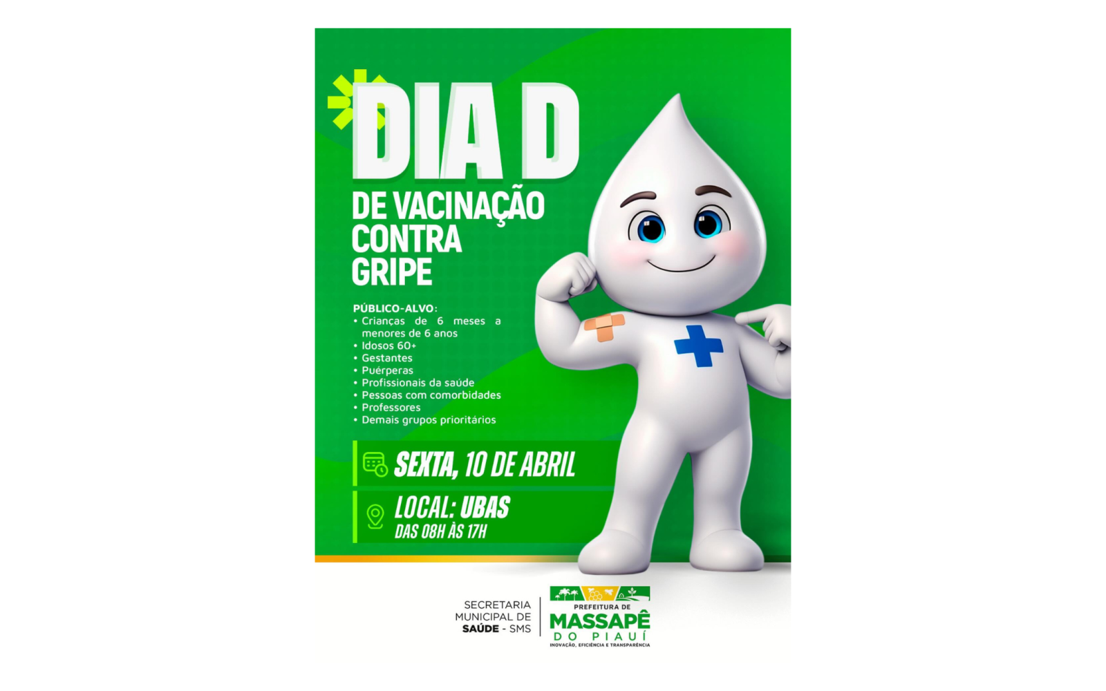 A Prefeitura de Massapê do Piauí, por meio da Secretaria Municipal de Saúde (SMS), realiza nesta sexta-feira, 10 de abril, o Dia D de Vacinação contra a Gripe, com atendimento na Unidade Básica de Saúde (UBAS) de José Joaquim de Moraes, localizada na sede do município. A ação ocorrerá das 08h às 17h e tem como objetivo ampliar a cobertura vacinal entre os grupos prioritários.