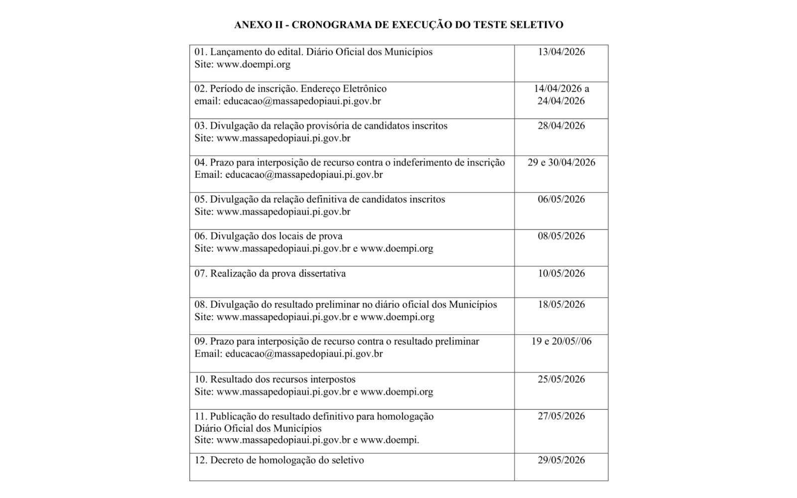 De acordo com a retificação, o processo seletivo teve seu edital lançado em 13 de abril de 2026, com inscrições previstas no período de 14 a 24 de abril de 2026, realizadas de forma eletrônica por meio do e-mail institucional da Secretaria Municipal de Educação. A iniciativa ocorre no município de Massapê do Piauí e tem como público os candidatos interessados em atuar na rede municipal de ensino.