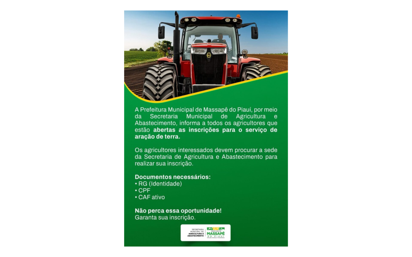 A Prefeitura de Massapê do Piauí, por meio da Secretaria Municipal de Agricultura e Abastecimento, está executando o Programa de Aração de Terras e convoca os produtores rurais massapeenses para realizarem o cadastro na iniciativa. A ação tem como objetivo apoiar agricultores no preparo do solo, com foco no fortalecimento da agricultura familiar e no suporte às atividades produtivas desenvolvidas ao longo do ano.