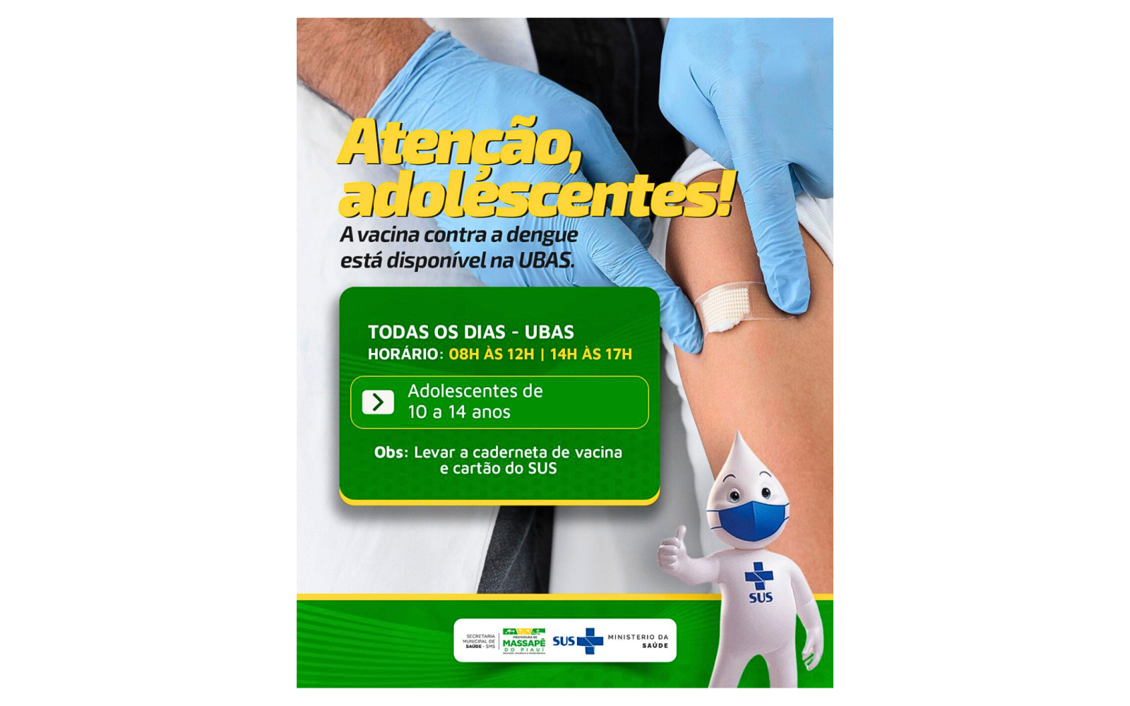 A Prefeitura de Massapê do Piauí, através da Secretaria Municipal de Saúde, está realizando a oferta da vacina contra a dengue para adolescentes de 10 a 14 anos na Unidade Básica de Saúde (UBAS) de José Joaquim de Moraes do município.